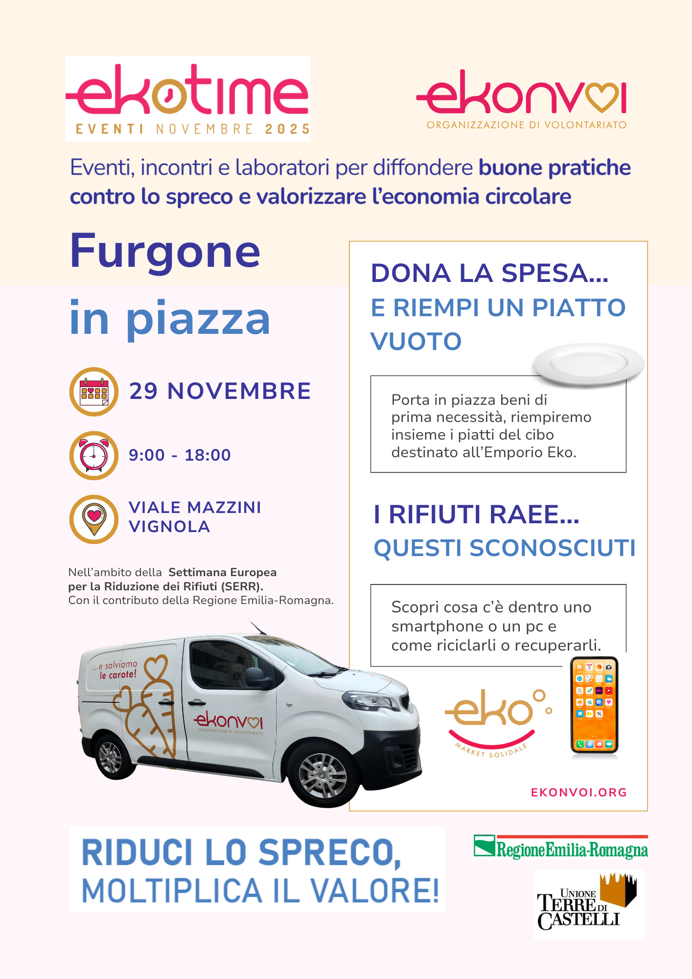 Presidio informativo con i furgoni e i volontari di Ekonvoi per fare divulgazione sui temi della lotta allo spreco e delle attività dell’Emporio Eko.